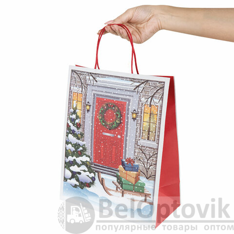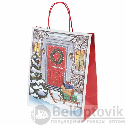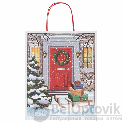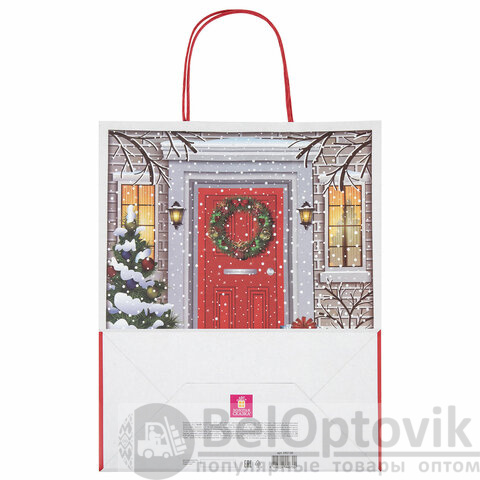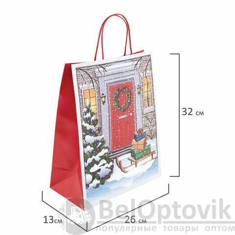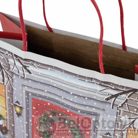 Подарочный пакет новогодний изготовлен из крафт-бумаги, снабжен бумажными ручками. Размер – 26x13x32 см. Пакет украшен изображением новогодних атрибутов.