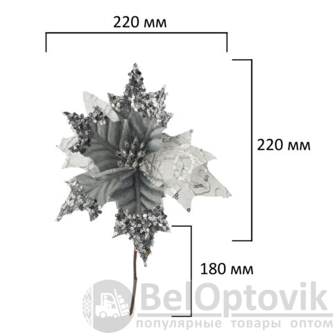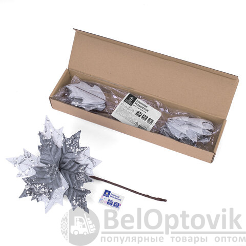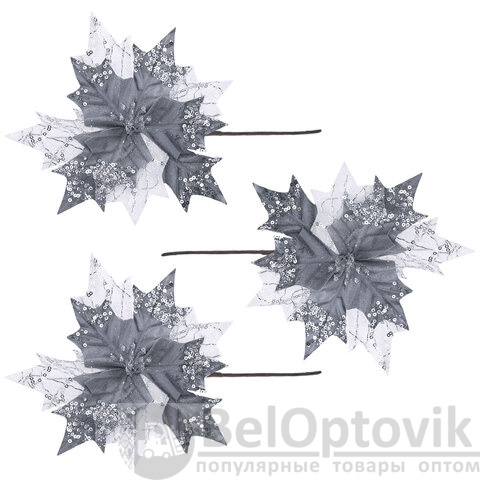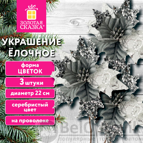 В комплекте 3 цветка. Поставляются в 1 цвете: серебристый. Диаметр украшения – 22 см, длина – 20 см. Материал – пластик, полиэстер, металл. Упакованы в картонную коробку.