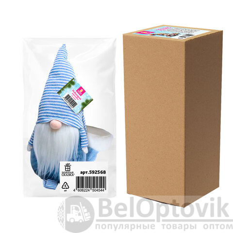 Гном упакован в пакет с клеевым краем, а затем в прочный гофрокороб. Материал – полиэстер, полипропиленовый хлопок, пенопласт, песок. Размер – 63 см.