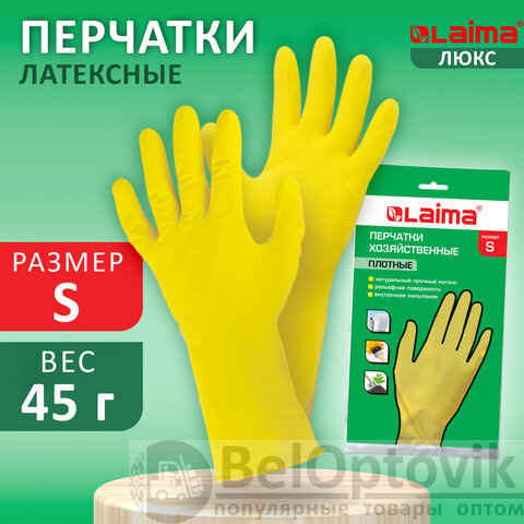 Перчатки МНОГОРАЗОВЫЕ латексные LAIMA "ЛЮКС", хлопчатобумажное напыление, ПЛОТНЫЕ, размер S (малый), желтые, вес 45 г, 600569