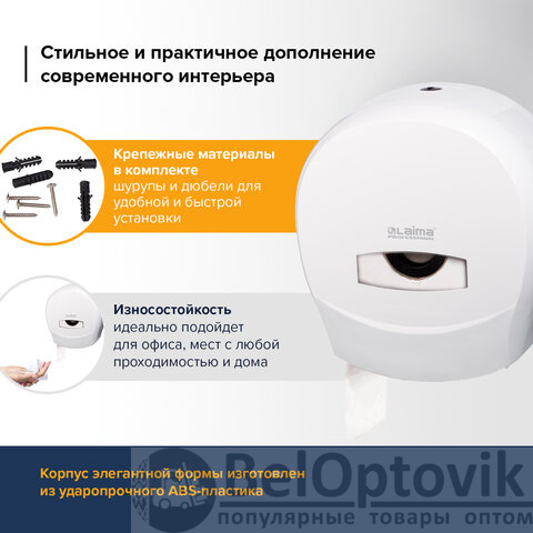 Диспенсер для туалетной бумаги LAIMA PROFESSIONAL подходит для использования в местах с любой проходимостью, таких как туалетная комната в ресторане, офисе, торговом центре, аэропорту. Отличается высокими эксплуатационными характеристиками.