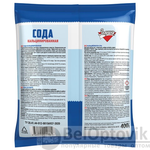 Замачивание белья: Растворите 15-20 г (2-3 столовые ложки) соды в 10 л теплой воды (30-45 °С). Положите загрязненное белье в полученный раствор на 2-4 часа, после чего прополощите, при необходимости постирайте. При выборе режима замачивания, стирки и температуры следуйте рекомендациям, указанным на ярлыках изделий.