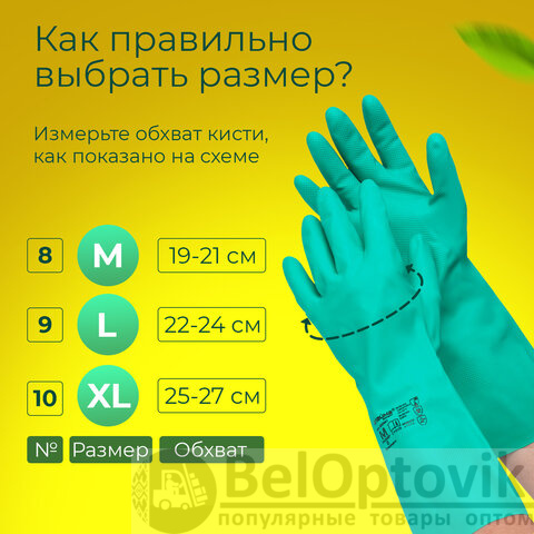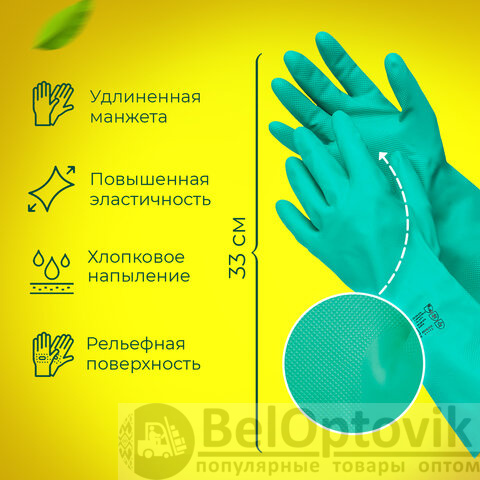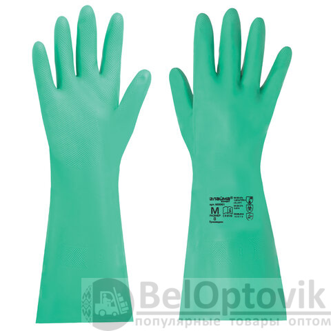 Надежное удержание скользких предметов благодаря рельефной текстуре. Перчатки толщиной 0,38 мм выполнены в зеленом цвете. Также могут применяться в пищевой промышленности. Имеют подкладку с хлопковым напылением. Длина - 330 мм.