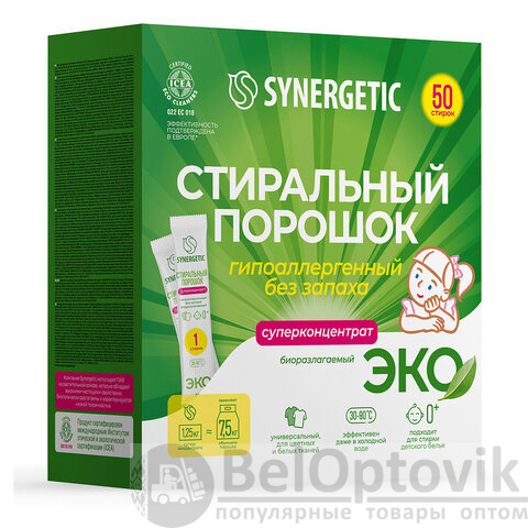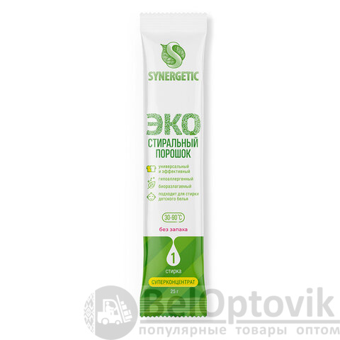 Стиральный порошок SYNERGETIC – экологичный, безопасный, универсальный, гипоаллергенный и эффективный суперконцентрат в стиках. Биоразлагаемый порошок создан на основе безопасных растительных компонентов, не вызывает раздражения кожи, аллергии, не оставляет запаха и подходит для стирки детского белья 0+ и одежды людей с чувствительной кожей. Подходит для белого и цветного белья из натуральных и синтетических тканей, для ручной и машинной стирки. Комбинация пяти видов энзимов, растительных ПАВ и натурального мыла эффективно удаляет загрязнения с волокон ткани даже в холодной воде и при коротких циклах стирки. Уникальный комплекс зеленых хелатов помогает устранить инкрустацию (посерение): естественный белый цвет возвращается к вещам уже после нескольких стирок. Стиральный порошок быстро растворяется в воде и не остается в одежде, полностью выполаскивается из волокон ткани. Экономичный и практичный формат стика удобен не только при использовании дома, но и для путешествий любым видом транспорта.
