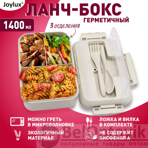 Многофункциональный герметичный ланч-бокс JOYLUX объемом 1400 мл имеет три отсека и изготовлен из пластика высокого качества – это универсальное и безопасное решение для полноценного сбалансированного приема пищи в офисе, школе, поездках и путешествиях!