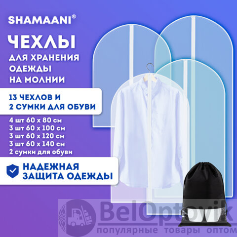Комплект из чехлов для одежды и сумок для обуви SHAMAANI позволяет сохранить вещи в чистоте. Чехлы и сумки предназначены для защиты вещей от пыли, воды, солнечных лучей, загрязнений различного рода и насекомых. Чехлы также будут незаменимы при транспортировке вещей во время переездов, путешествий и других длительных поездок.