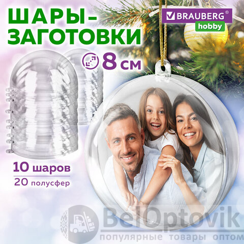 Пластиковые шары для поделок BRAUBERG HOBBY предназначены для взрослых, увлекающихся творчеством, и детей старше 3 лет. В набор входят 20 половинок (полусфер) из прозрачного пластика диаметром 8 см. Они имеют удобную конструкцию с "ушками", которые необходимо соединить, чтобы получилась петля для подвешивания. Таким образом из 20 половинок образуются 10 прозрачных пластиковых шаров, являющихся замечательными заготовками как для новогоднего творчества, так и для интерьерных украшений – гирлянд, фотоподелок, мобиля.