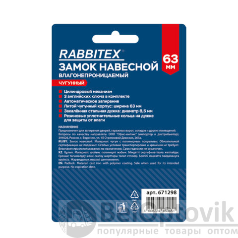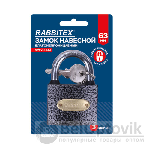 Замок навесной чугунный "Влагонепроницаемый", ширина 63 мм, полимерное покрытие, английский, 3 ключа, RABBITEX, 671298