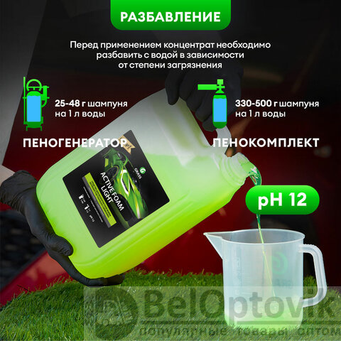 Способ применения: перед нанесением средство необходимо разбавить с водой из расчета 1:1-1:2 (330-500 г) в пенокомплект (1 л) или 1:20-1:40 (25-48 г/л) для пеногенератора (25, 50, 100 л) в зависимости от степени загрязнения. При необходимости сбить верхний слой грязи. Остудить кузов автомобиля, после чего нанести разбавленный состав снизу вверх, чтобы избежать подтеков. Выдержать 1-2 минуты, не допуская высыхания! Тщательно смыть водой под высоким давлением с близкого расстояния (15-20 см) снизу вверх.
