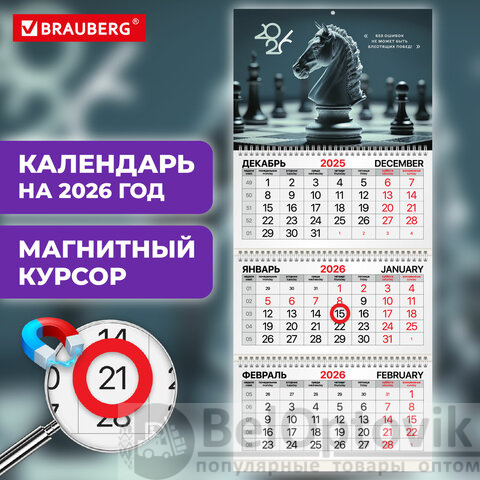 Календарь квартальный 2026 г., 3 блока, 3 гребня, магнитный курсор, мелованная бумага, BRAUBERG, "Ход конем", 116908