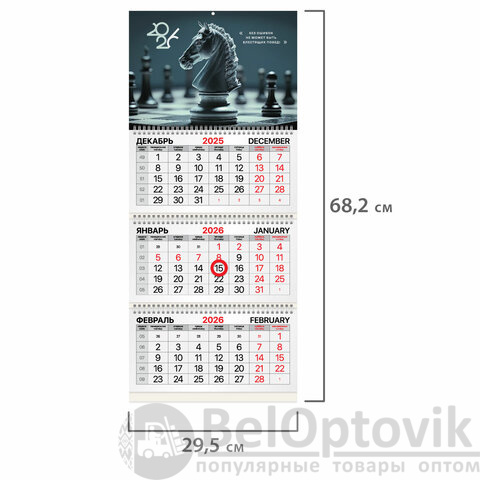 Офисный календарь на 2026 год на 3-х гребнях. Для удобства планирования состоит из 3-х блоков с календарными сетками на три месяца – предыдущий, текущий и последующий. Блок календаря напечатан на мелованной бумаге плотностью 80 г/м2. Подложка изготовлена из мелованного картона плотностью 250 г/м2. Магнитный курсор-бегунок выделяет текущую дату. Вертикальное расположение. Размер – 29,5х68,2 см.
