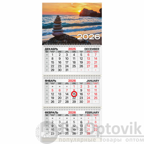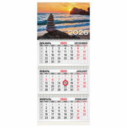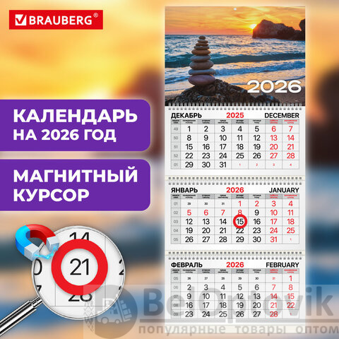 Календарь квартальный 2026 г., 3 блока, 3 гребня, магнитный курсор, мелованная бумага, BRAUBERG, "Закат", 116911
