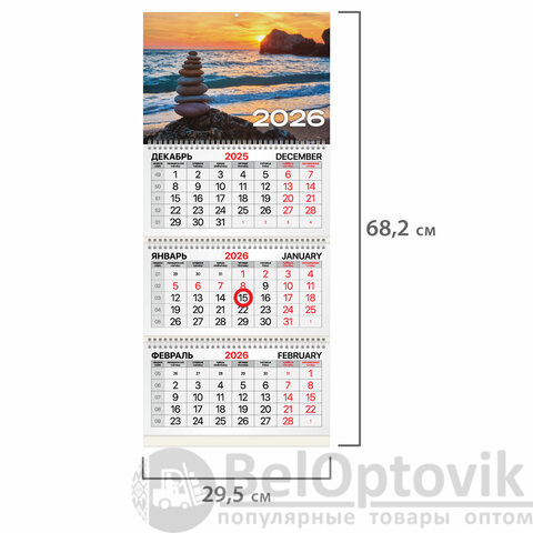 Офисный календарь на 2026 год на 3-х гребнях. Для удобства планирования состоит из 3-х блоков с календарными сетками на три месяца – предыдущий, текущий и последующий. Блок календаря напечатан на мелованной бумаге плотностью 80 г/м2. Подложка изготовлена из мелованного картона плотностью 250 г/м2. Магнитный курсор-бегунок выделяет текущую дату. Вертикальное расположение. Размер – 29,5х68,2 см.