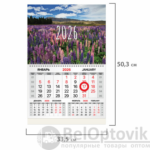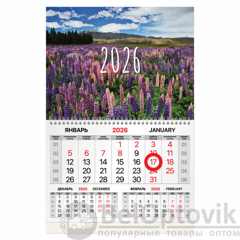 Календарь квартальный 2026 г., 1 блок, 1 гребень, магнитный курсор, мелованная бумага, BRAUBERG, "Люпины", 116915