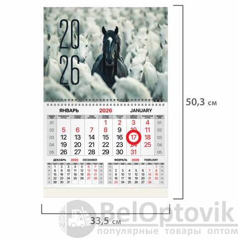 Офисный календарь на 2026 год на гребне. Состоит из 1 блока с календарными сетками на три месяца с магнитным курсором. Блок календаря напечатан на мелованной бумаге плотностью 80 г/м2. Подложка изготовлена из мелованного картона плотностью 250 г/м2. Магнитный курсор-бегунок выделяет текущую дату. Вертикальное расположение. Размер – 33,5х50,3 см.