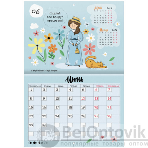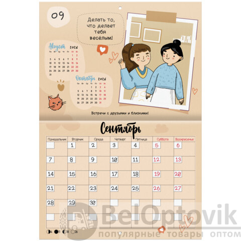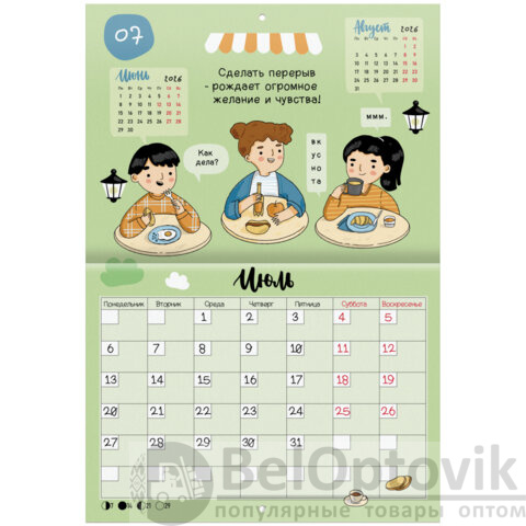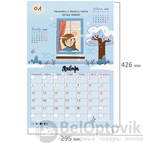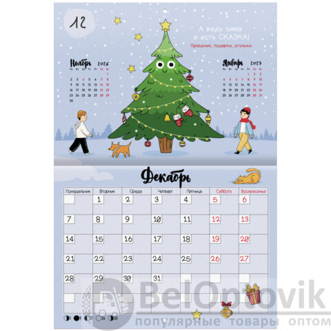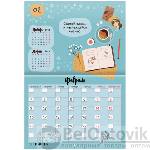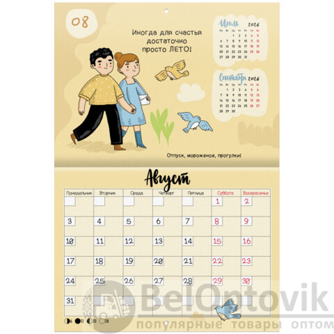 Яркая, красочная картинка дополнена календарной сеткой на месяц с местом для записи на каждый день. Содержит 12 листов. Блок календаря напечатан на мелованной бумаге плотностью 130 г/м2. Обложка изготовлена из мелованной бумаги плотностью 230 г/м2. Размер – 29,5х21,3 см, в развороте – 29,5х42,6 см. Дополнен отверстием для удобства крепления. Поставляется в индивидуальной упаковке (полибэг) с европодвесом и прокладкой из гофрокартона, что создает товару дополнительную защиту.