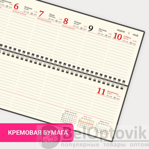 Внутренний блок содержит 60 листов офсетной бумаги кремового цвета плотностью 70 г/м2. Обложка из экокожи синего цвета и твердый переплет обеспечивают долгий срок службы. Для заметок в планинге имеется 11 страниц в конце внутреннего блока. Подходит для горячего тиснения. Скрепление осуществляется с помощью евроспирали. Размер изделия – 305х140 мм.