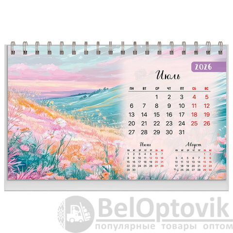 Яркая, красочная картинка дополнена календарной сеткой на месяц. Содержит 6 листов (с каждой стороны листа по 1 месяцу). Блок календаря напечатан на мелованной бумаге плотностью 110 г/м2. Подложка изготовлена из импортного картона плотностью 280 г/м2, обложка – с ярким дизайном. Стильный и удобный. Размер – 160х110 мм. Горизонтальное расположение. Поставляется в индивидуальной упаковке (пакет с липким краем).