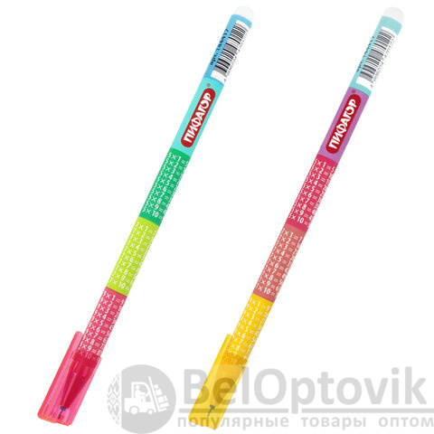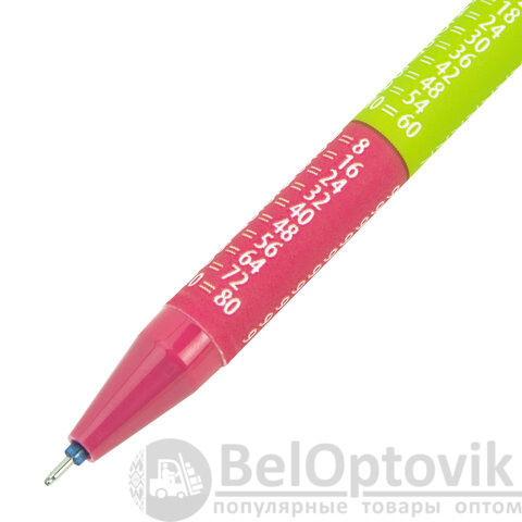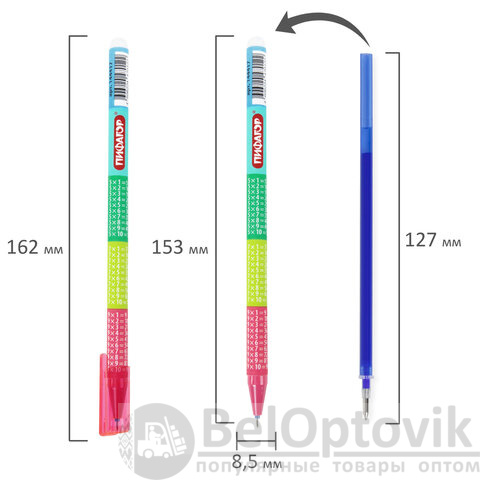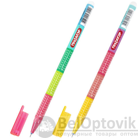 Ручка представлена в ярких дизайнах с таблицей умножения на корпусе – с ней процесс обучения станет проще. Специальные гелевые чернила синего цвета мягко и плавно ложатся на бумагу без усилий, а при нагревании становятся невидимыми. Нагрев достигается ластиком, встроенным в корпус ручки. Диаметр пишущего узла 0,5 мм создает тонкую линию письма 0,35 мм. Возможно многократное стирание и повторное письмо.