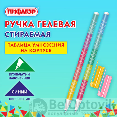 Ручка стираемая гелевая ПИФАГОР "ТАБЛИЦА УМНОЖЕНИЯ", СИНЯЯ, корпус ассорти, игольчатый наконечник 0,5 мм, линия 0,35 мм, 144417