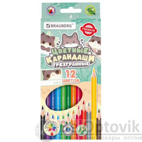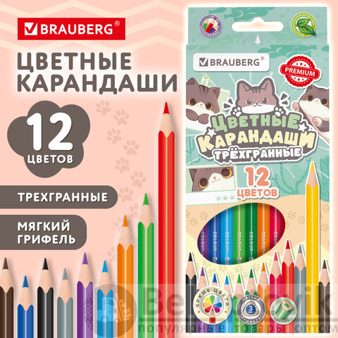 Карандаши цветные кросс-серия МИЛЫЕ КОТЫ, 12 цветов, трехгранные, BRAUBERG, 182109