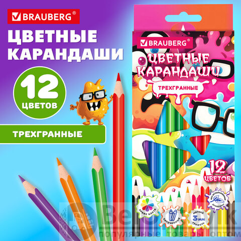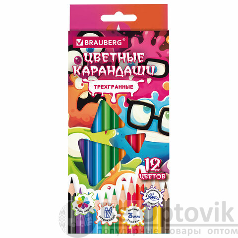 Карандаши цветные кросс-серия МОНСТРИКИ, 12 цветов, трехгранные, BRAUBERG, 182112