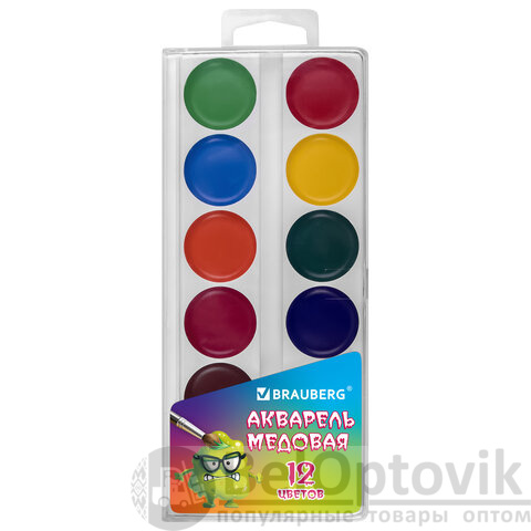Краски акварельные BRAUBERG "МОНСТРИКИ", медовые, 12 цветов, круглые кюветы, 192641