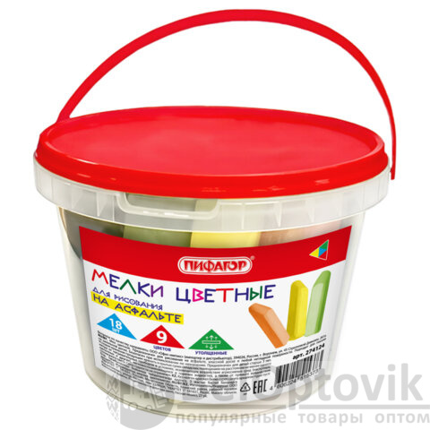 Мел в ведерке для рисования на асфальте 18 штук, ПИФАГОР, цветной квадратный утолщенный, 274124