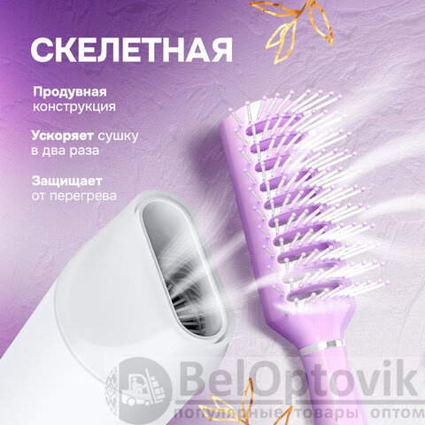 Скелетная расческа для безопасной укладки феном. Многочисленные вентиляционные отверстия оптимизируют поток горячего воздуха, ускоряя сушку и защищая волосы от перегрева.