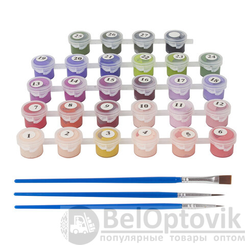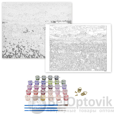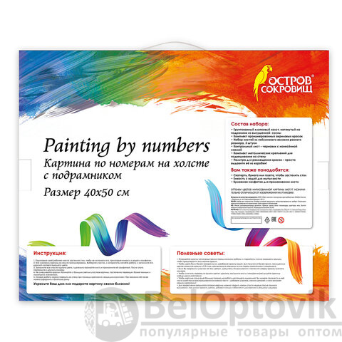 - Комплектация: акриловые краски, кисть, крепеж, лист бумаги для тренировки, холст на подрамнике