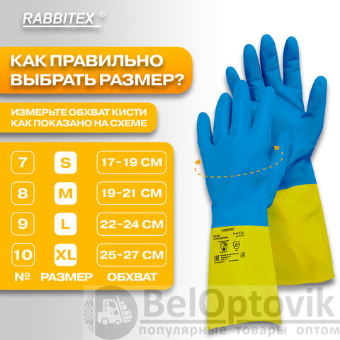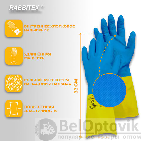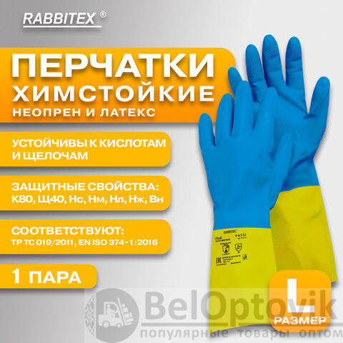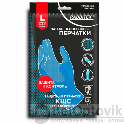 Неопреновые перчатки RABBITEX для защиты рук от загрязнений и химических факторов - кислот, щелочей, нефтепродуктов, растительных и животных масел и жиров, а также от воды и растворов нетоксичных веществ. Могут применяться в быту и на производстве.