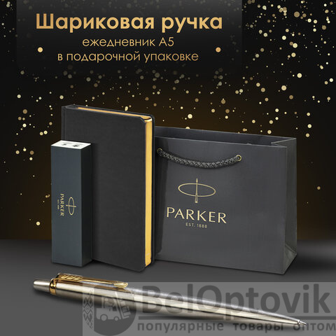 В набор входит ручка в подарочной коробке, ежедневник недатированный А5 черный, подарочный пакет с логотипом PARKER.