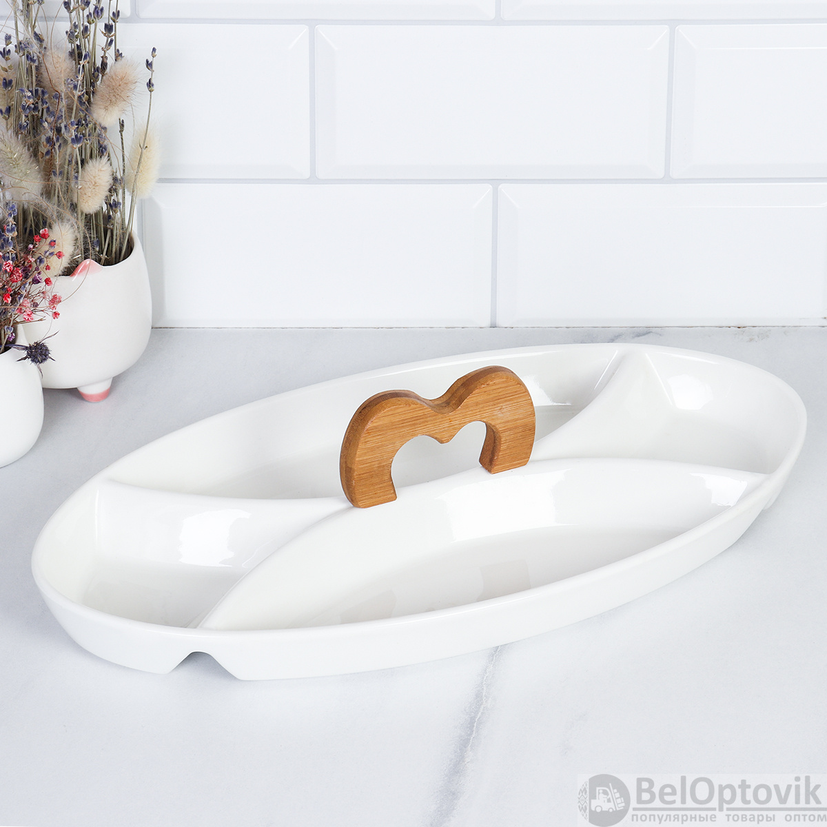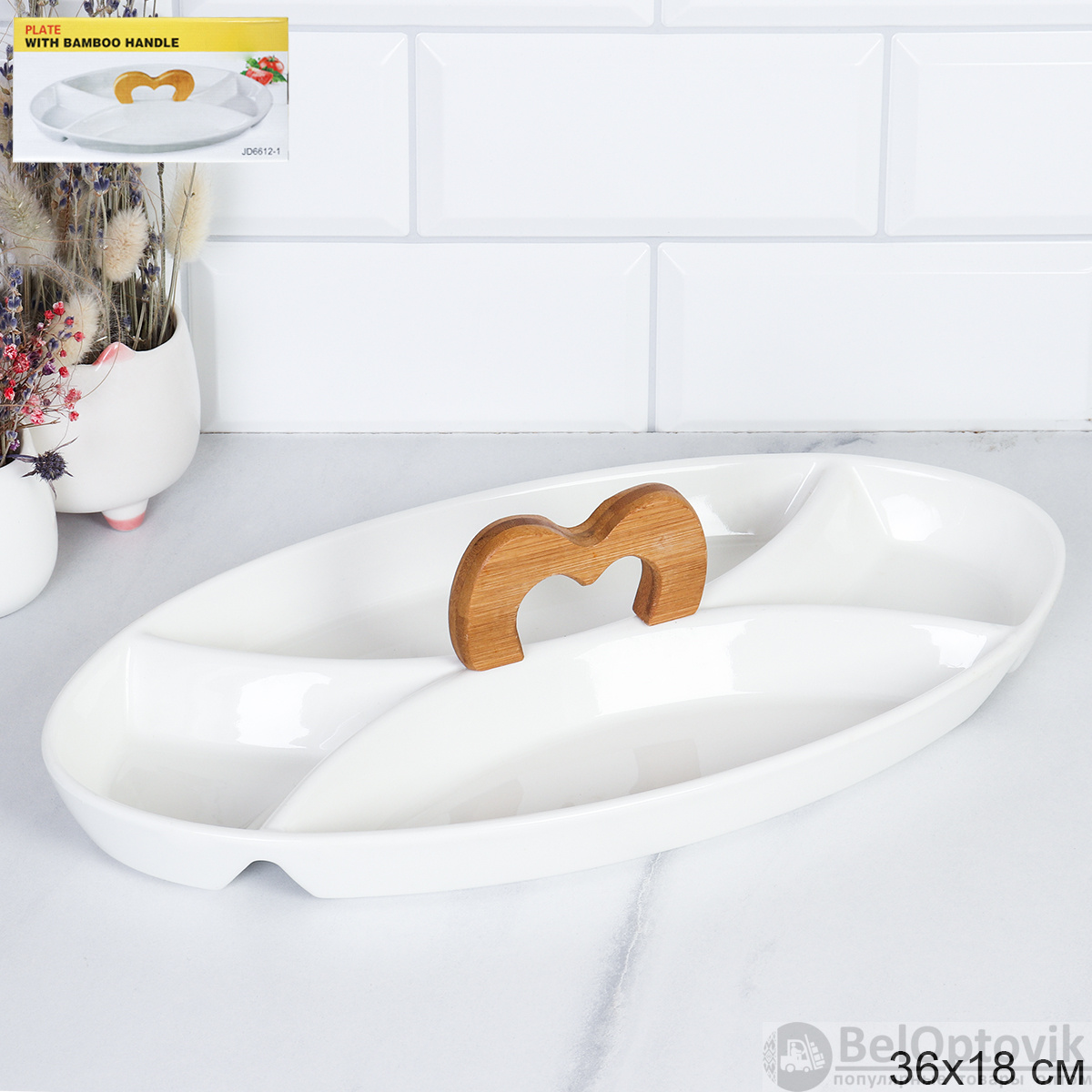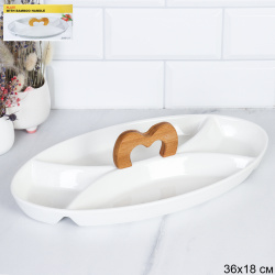 4 секции удобны для подачи закусок, соусов и десертов. Деревянная ручка добавляет эстетики и удобства. Изготовлена из безопасных материалов.