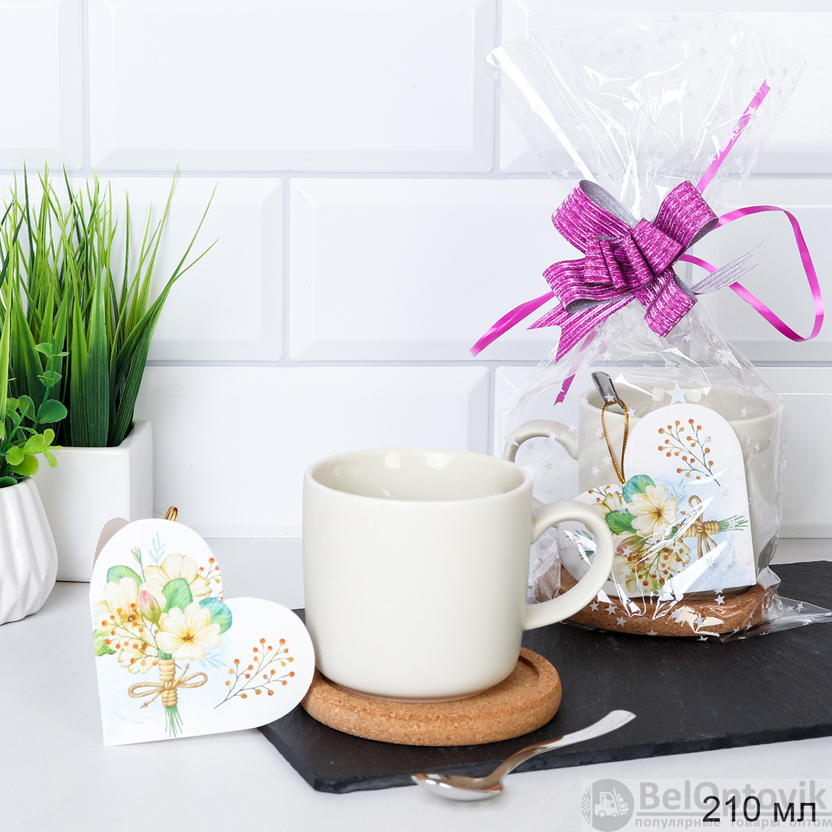 Кружка 210 мл с подставкой под горячее + ложка / TF-502 /уп/ в подарочной упаковке/ АКЦИЯ