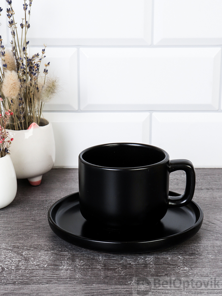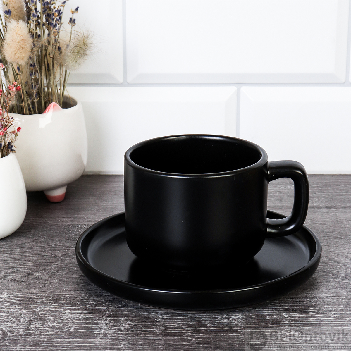 Комплект из чашки и блюдца в современном черном цвете подойдет для повседневного использования и торжественных мероприятий.