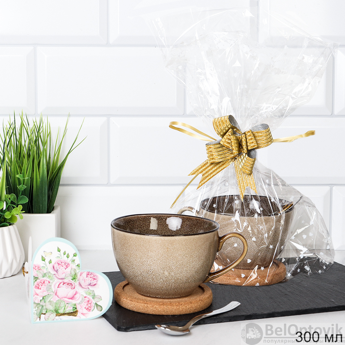 Стильная кружка с фактурой «гранит» дополнена удобной подставкой и чайной ложкой. Идеальный вариант для подарка коллегам или друзьям.