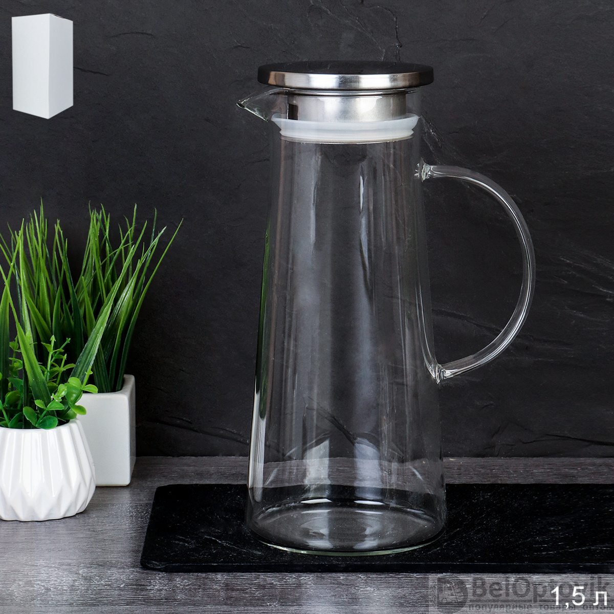 Объёмный кувшин на 1.5 литра с герметичной металлической крышкой идеально подходит для хранения соков, компотов и других напитков. Преимущества модели: