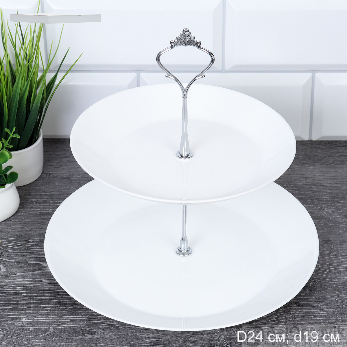 Двухъярусная ваза из белого прочного пластика создаст эффектную подачу блюд. Особенности: