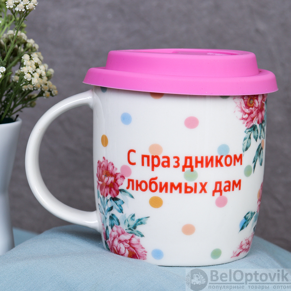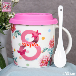 Кружка с крышкой силиконовой,ложка / 400 мл/ 8 марта/ C932 /уп 72/белая