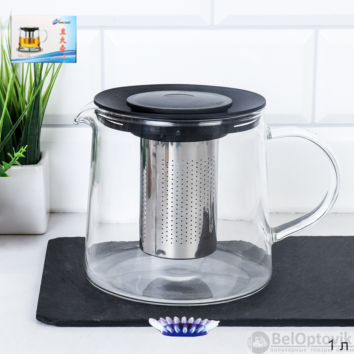 Объем 1000 мл из жаропрочного стекла с нейлоновой крышкой. Подходит для использования на индукционных плитах.
