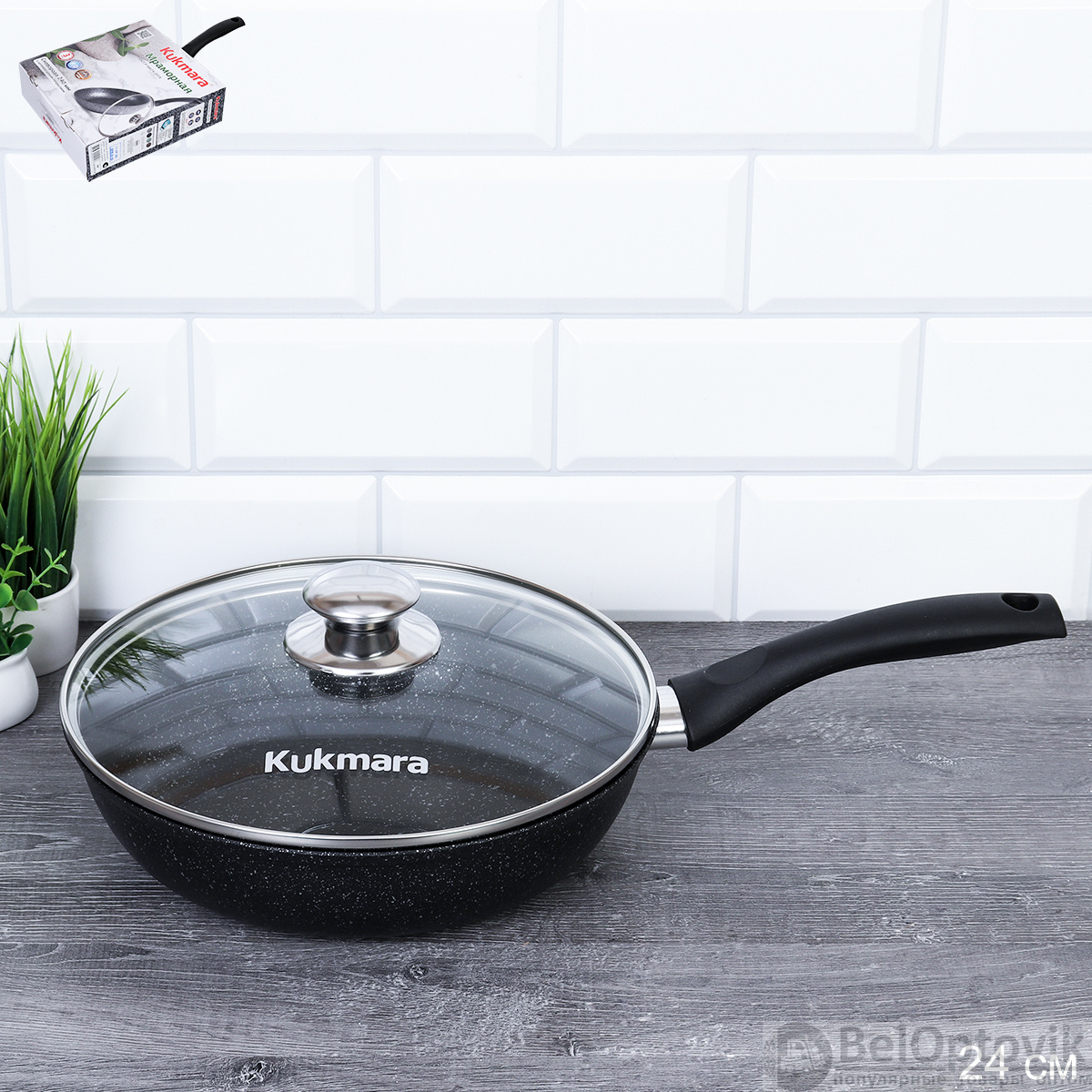 Сковорода Kukmara с антипригарным покрытием «Темный мрамор», диаметр 24 см. В комплекте стеклянная крышка и съемная ручка.