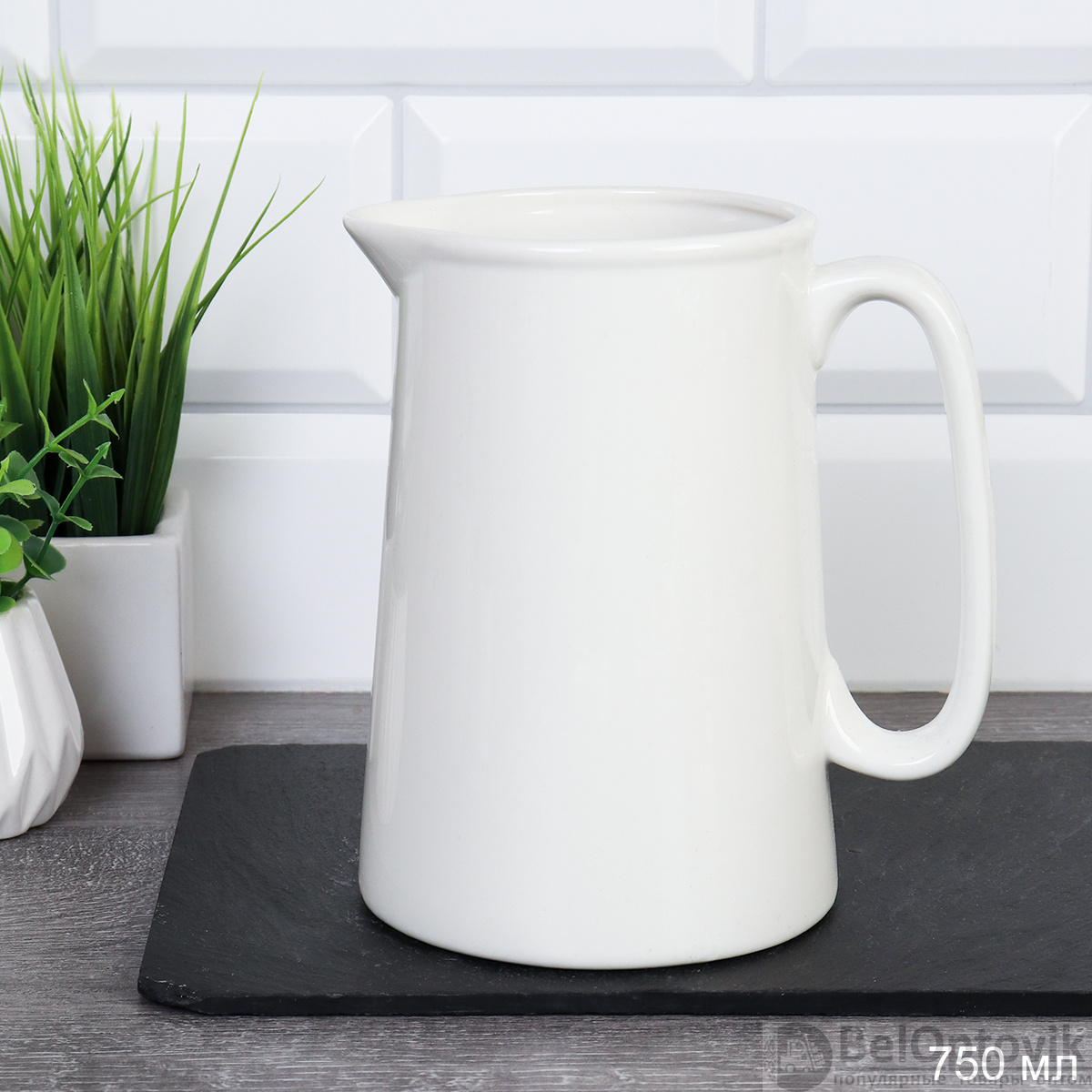 Стеклянный кувшин объемом 750 мл с эргономичной ручкой. Подходит для напитков, декора и хранения сыпучих продуктов.