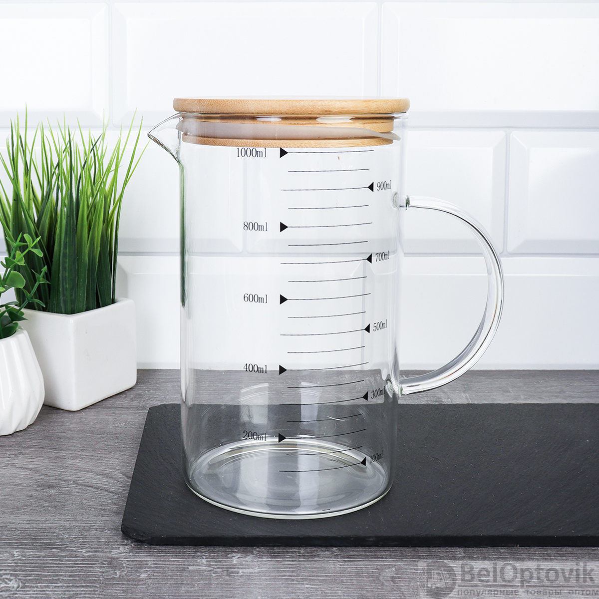 Мерный кувшин с бамбуковой крышкой — незаменимый помощник на кухне. Чёткая шкала позволяет точно отмерять ингредиенты.