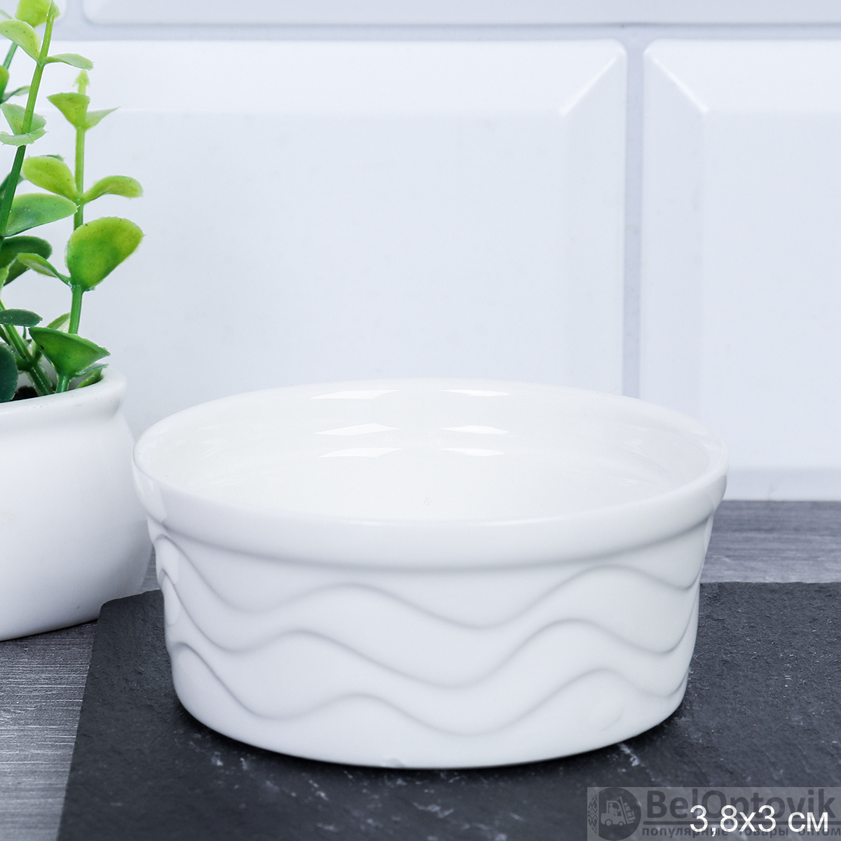 Круглый соусник диаметром 8 см подходит для подачи соусов, меда или джема. Изготовлен из термостойкого фарфора, сохраняет температуру содержимого.