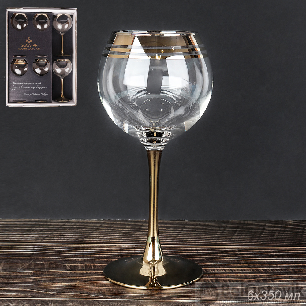 Набор из 6 фужеров объёмом 350 мл с гравировкой «Ностальжи 9». Толщина стекла — 0.8 мм, высота ножки — 9 см.
