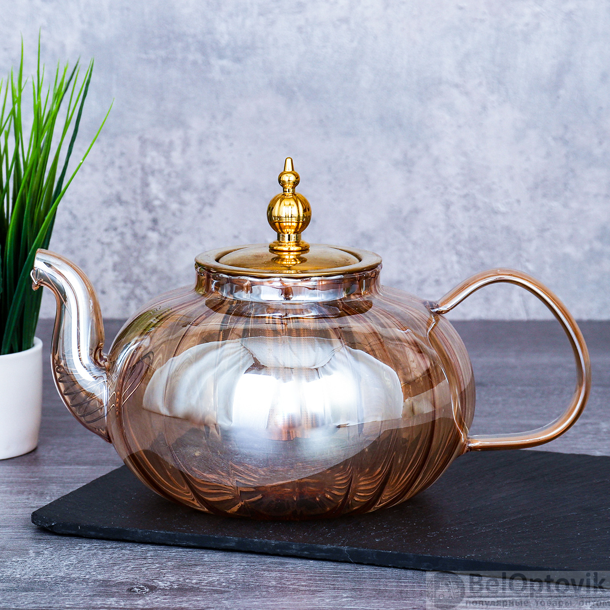 Заварочный чайник из термостойкого стекла с рифленой поверхностью и встроенным ситом. Объем 900 мл позволяет готовить напиток для компании. Тонированные стенки скрывают налет.