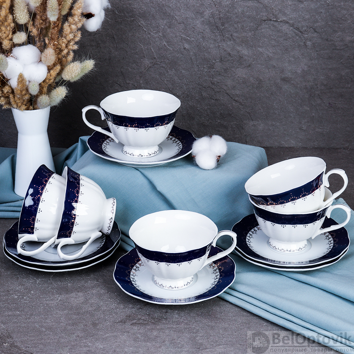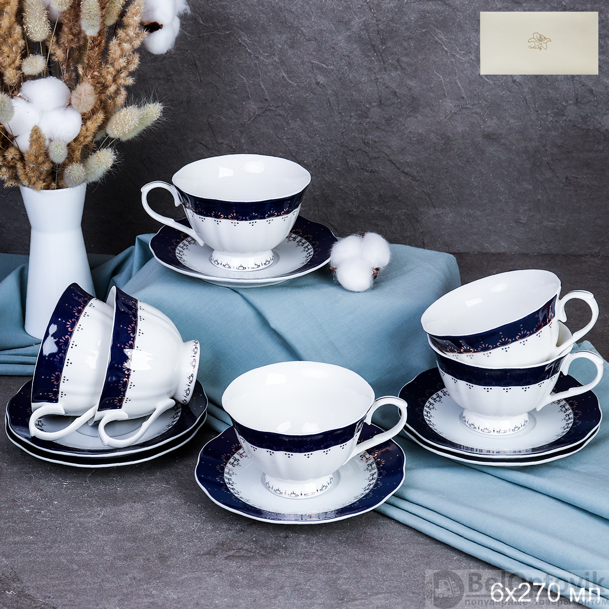 Чайный набор 12 предметов 270 мл на ножке Кобальт / KR-1680 /уп 6/ Костяной фарфор