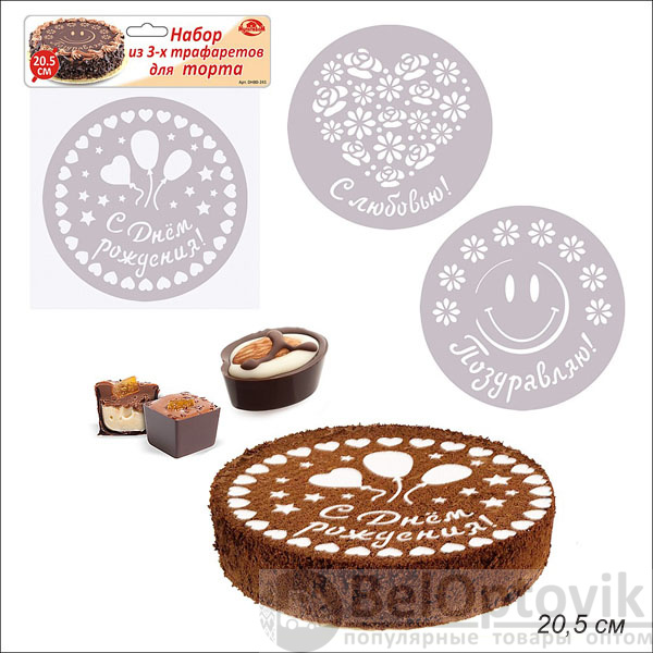 Набор из трёх декоров для торта длиной 20,5 см каждый. Позволяет создавать фигурные узоры, надписи и рельефные текстуры на поверхности десертов.