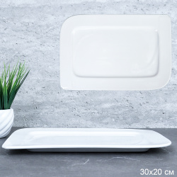 Прямоугольное блюдо размером 30х20 см подходит для подачи закусок, мяса или десертов. Изготовлено из долговечного материала с глянцевой поверхностью.