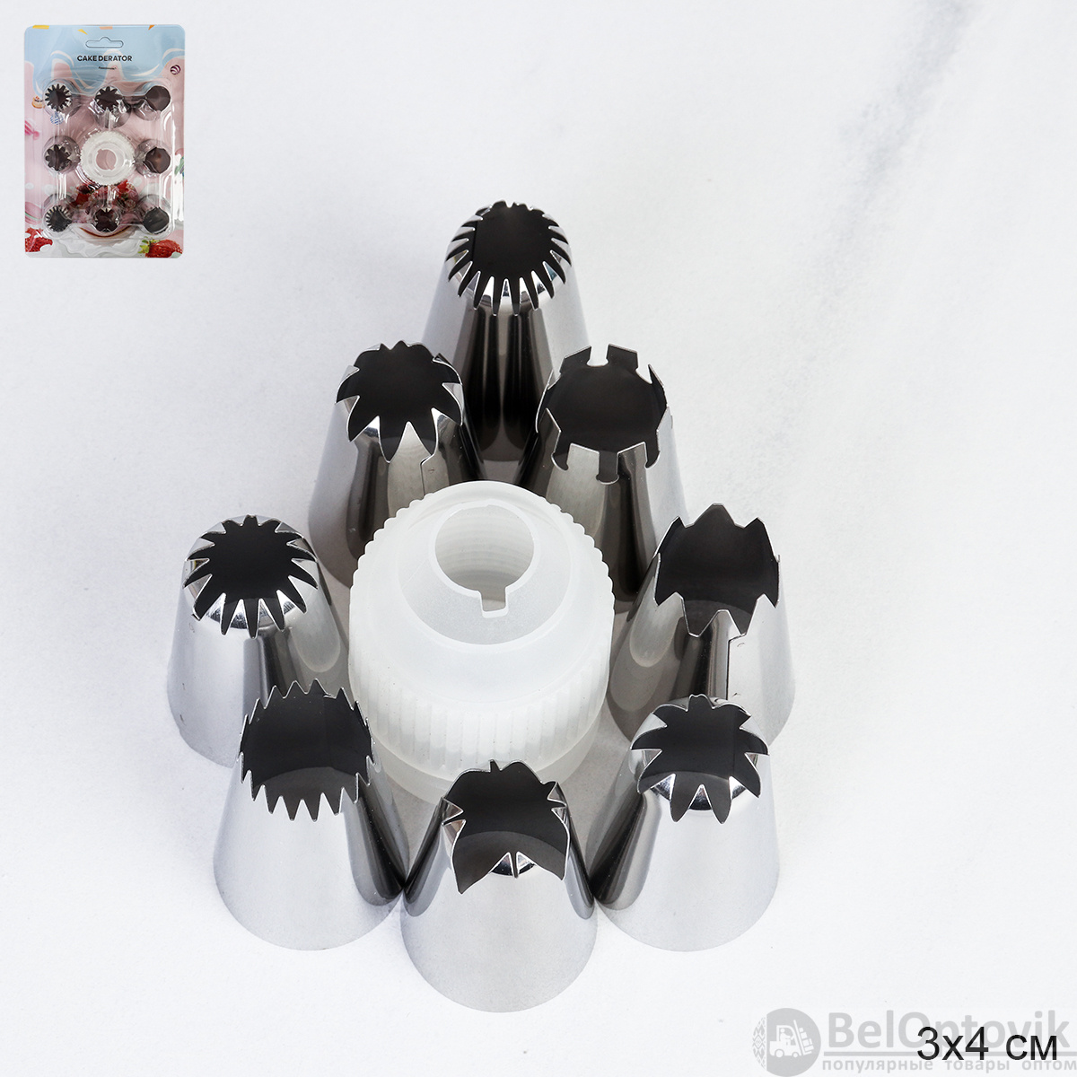 Набор из 8 металлических насадок с адаптером подходит для кремов, муссов и мастики. Диаметр основания 30 мм совместим с большинством кондитерских мешков.